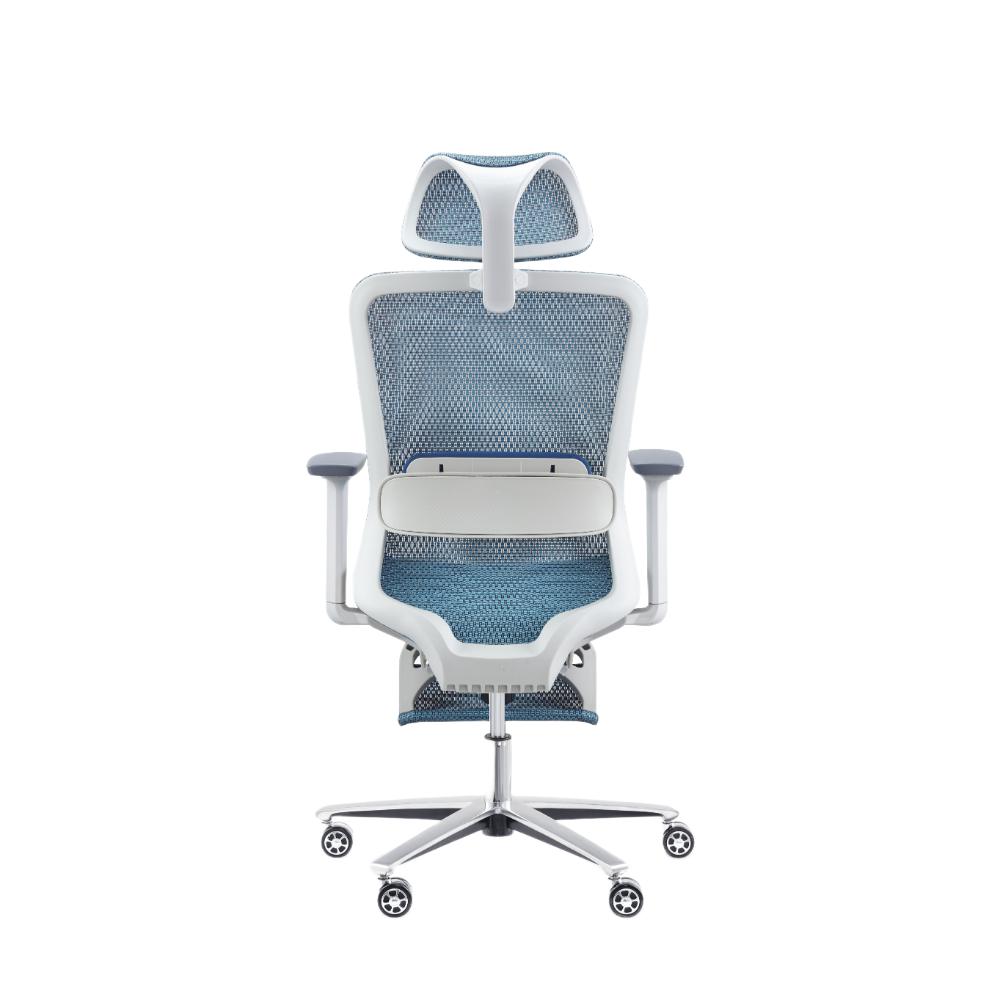 - Grey nylon back with ergonomic lumbar support and mesh uph.